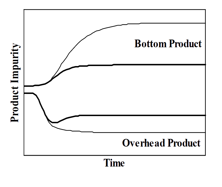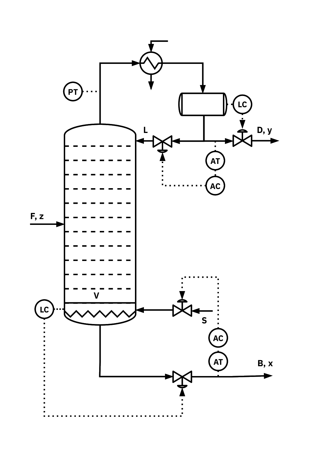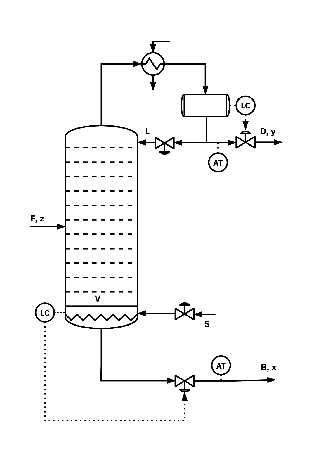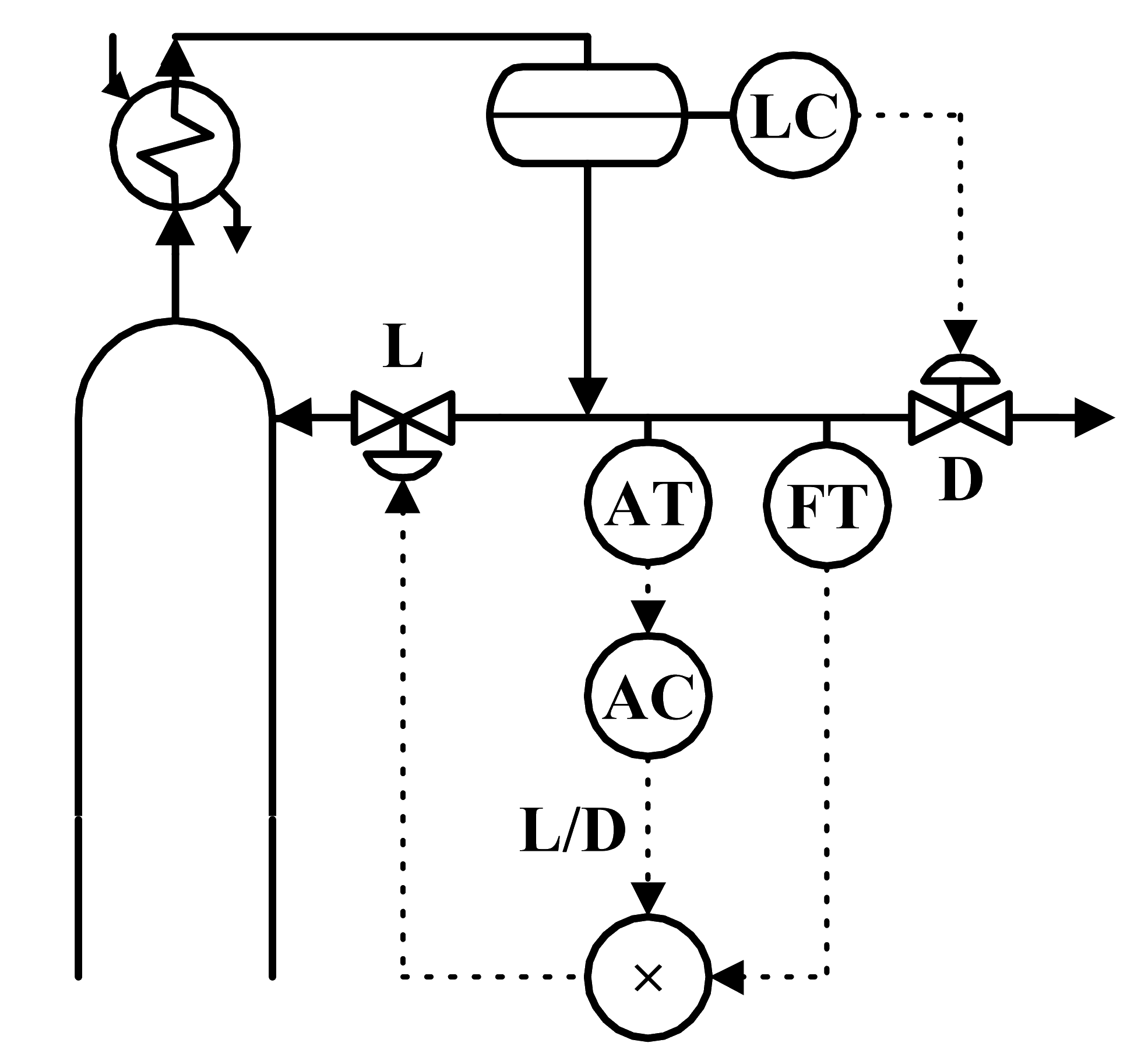That change in S disturbs yD; the reflux loop trims L until yD returns to setpoint.