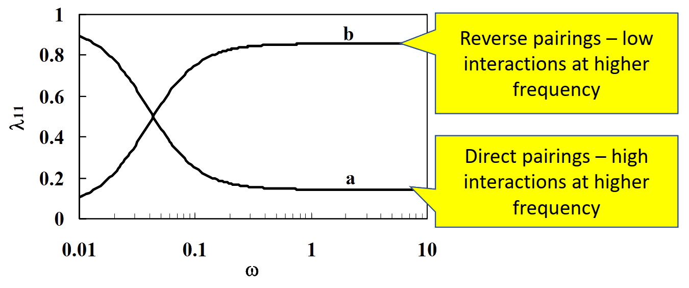 Dynamic RGA evaluates interaction strength as a function of frequency ω.