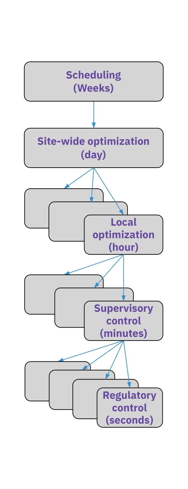 Several layers: regulatory, supervisory, optimization, scheduling.