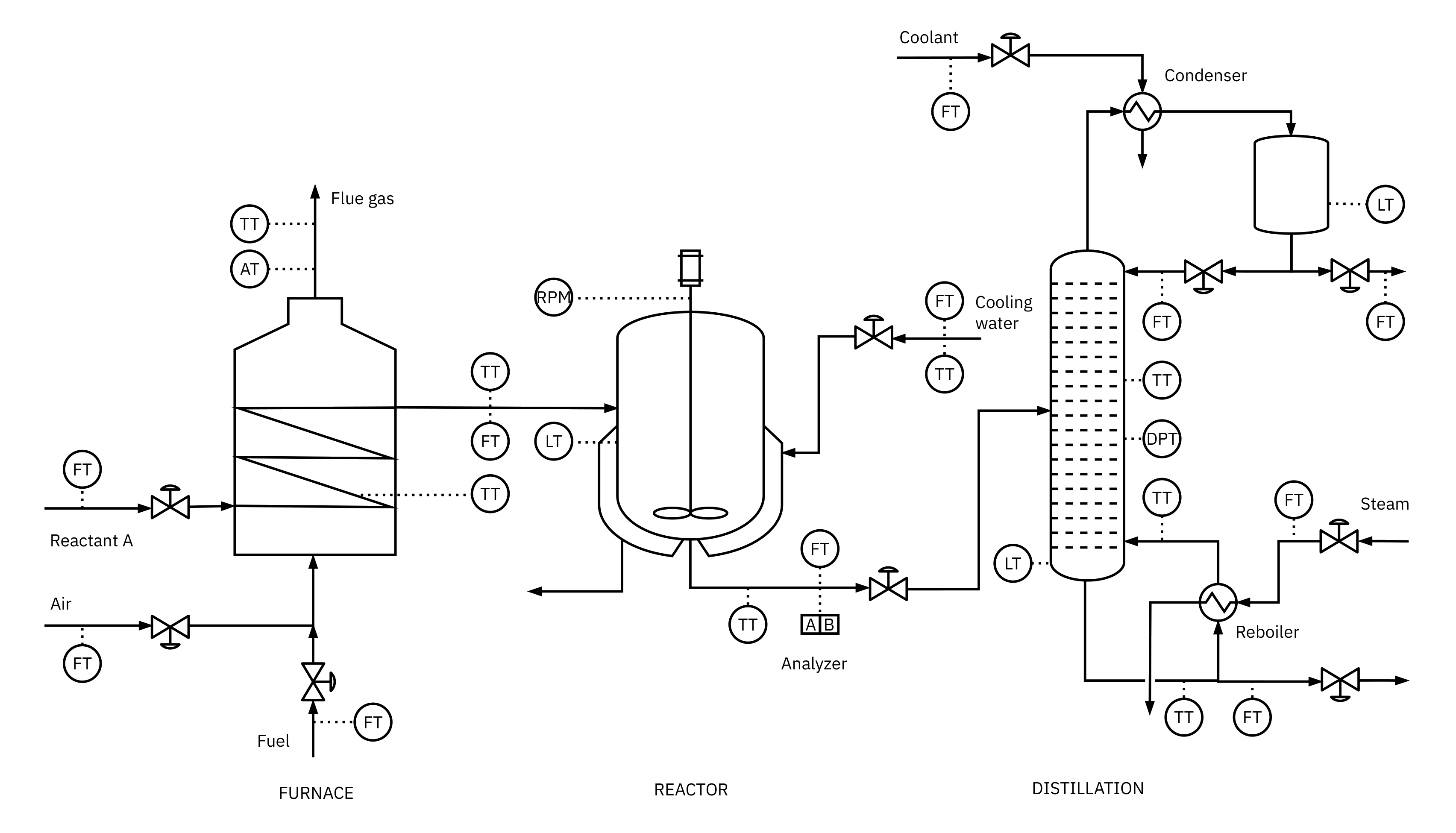 | Keep reactor safe | Treactor (°C) [CV] | < Tmax, HH trip at Ttrip | Coolant flow, jacket duty | Cascade temperature to coolant valve, HH trip independent of PID. |